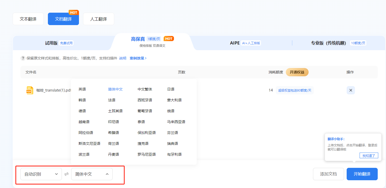 文件上傳成功后,就可以開始選擇語言了。26種語言精準互譯,原文語言可以自動識別,我們選好目標語言為英語即可。