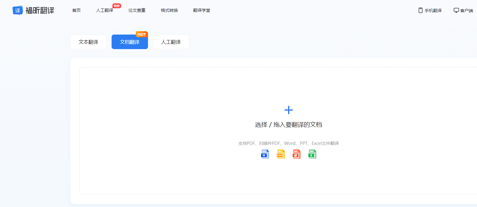 進入頁面后,選擇【文檔翻譯】,然后上傳你要翻譯的文件,可以批量傳。支持翻譯Word、PDF、Excel、PPT格式文檔。